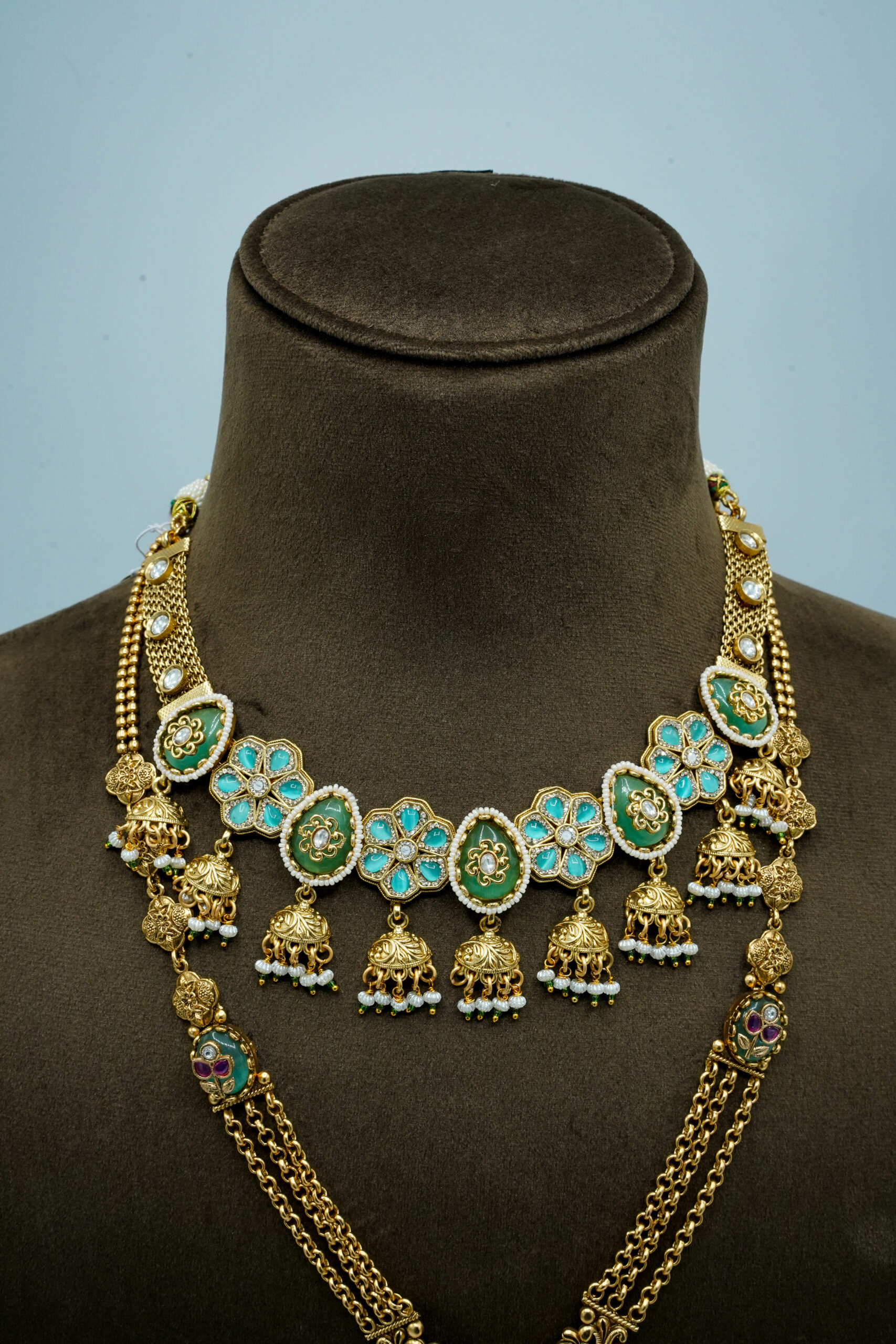 The Choker features a repeating floral pattern in turquoise, fringed with petite gold Jhumkas. The Long Necklace mirrors this aesthetic with a triple-strand gold chain leading to an intricately embossed temple-style pendant.