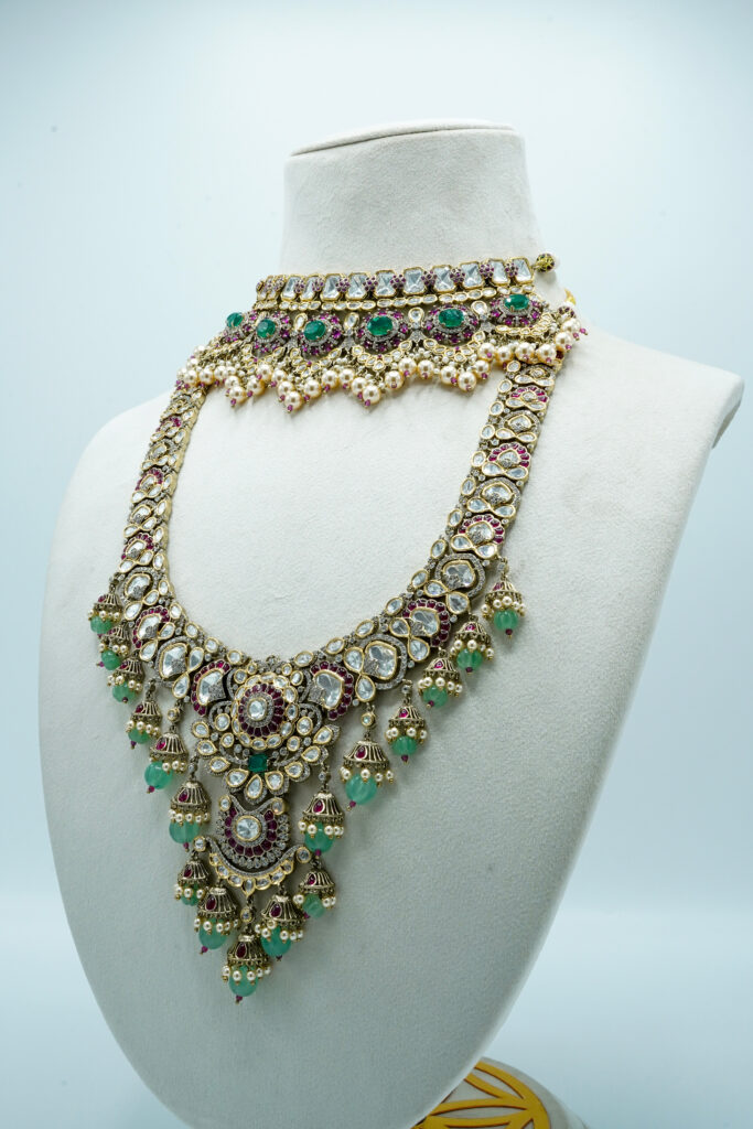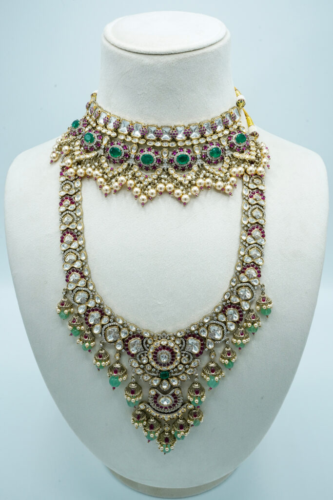 • Dynamic Movement: Both necklaces and the earrings feature traditional “Jhumka” (bell) drops that add graceful movement and sound.