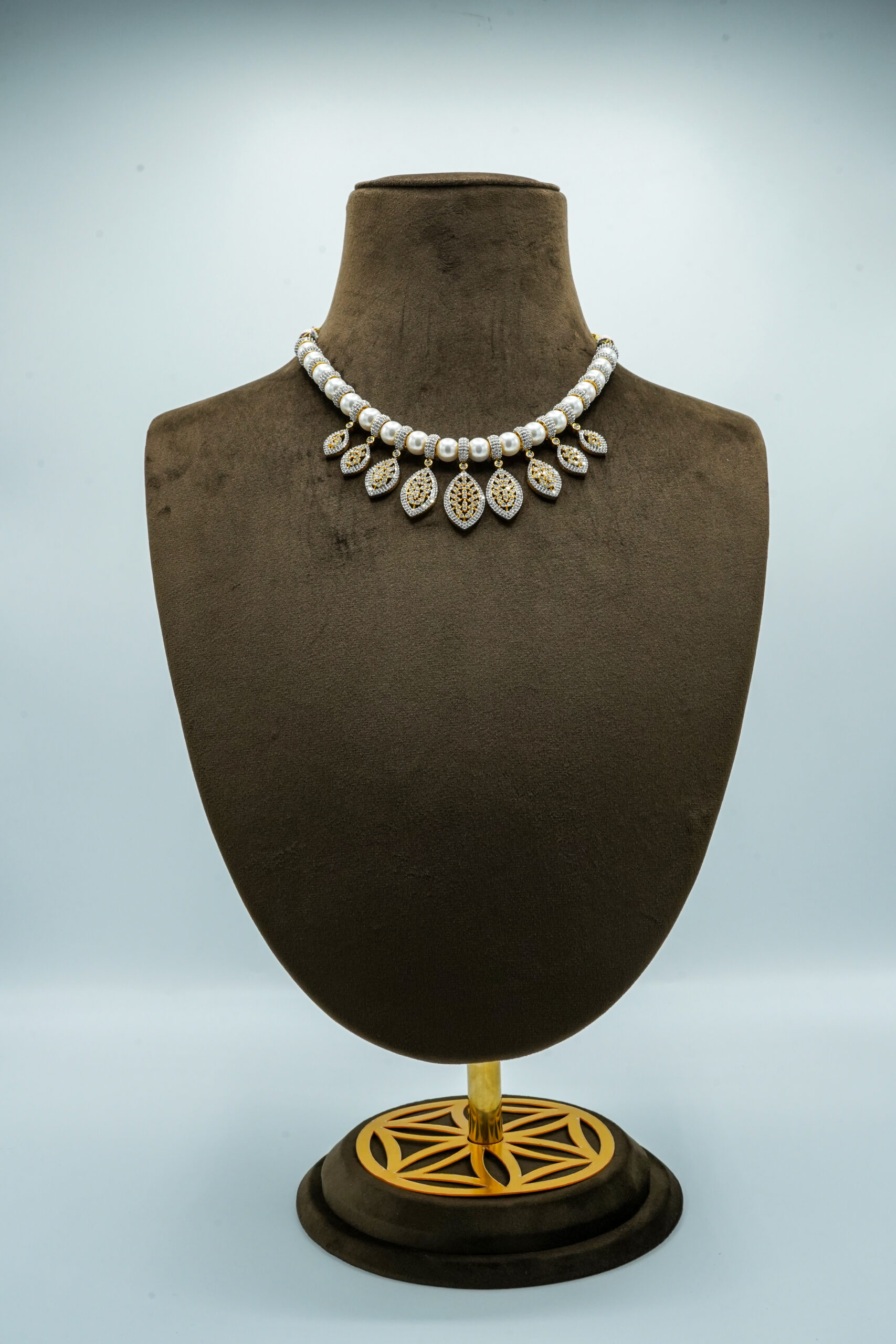 Elegant Two-Tone Floral Lattice Pearl Set | Shimmering CZ Crystal Fashion Necklace & Earrings (43C)