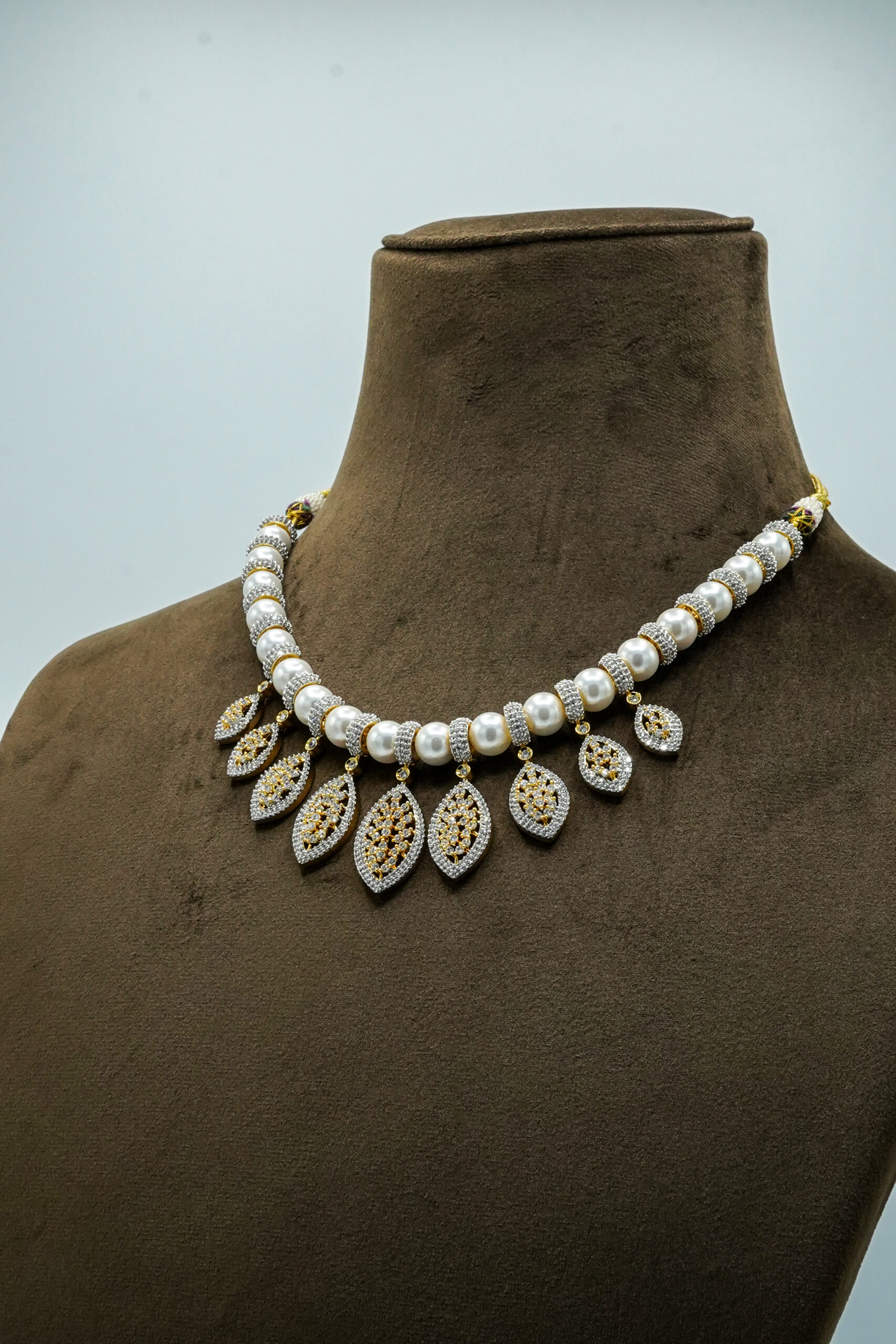 Contemporary Designer Look: A stylish fusion of large faux pearls and intricate leaf-shaped lattice charms.