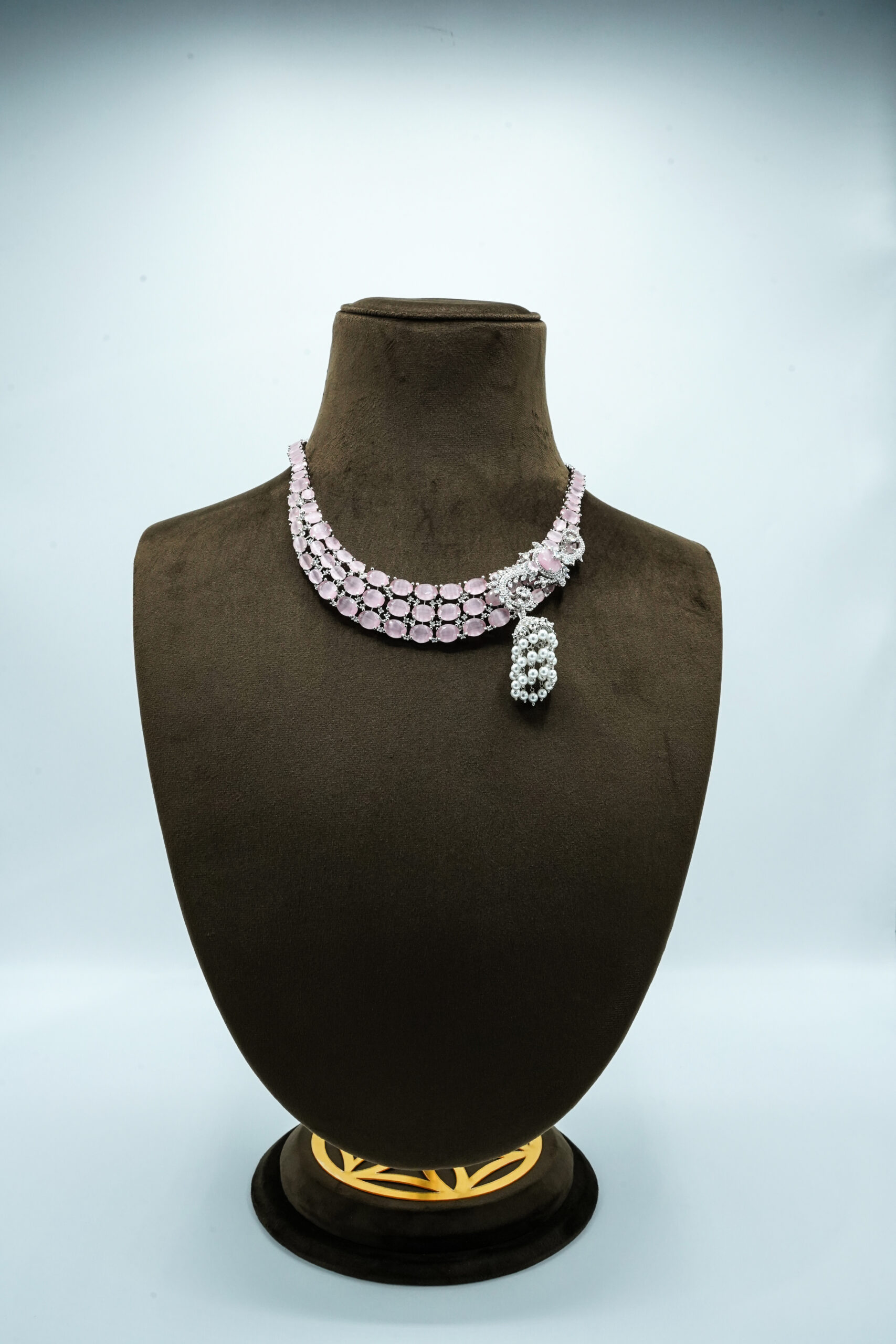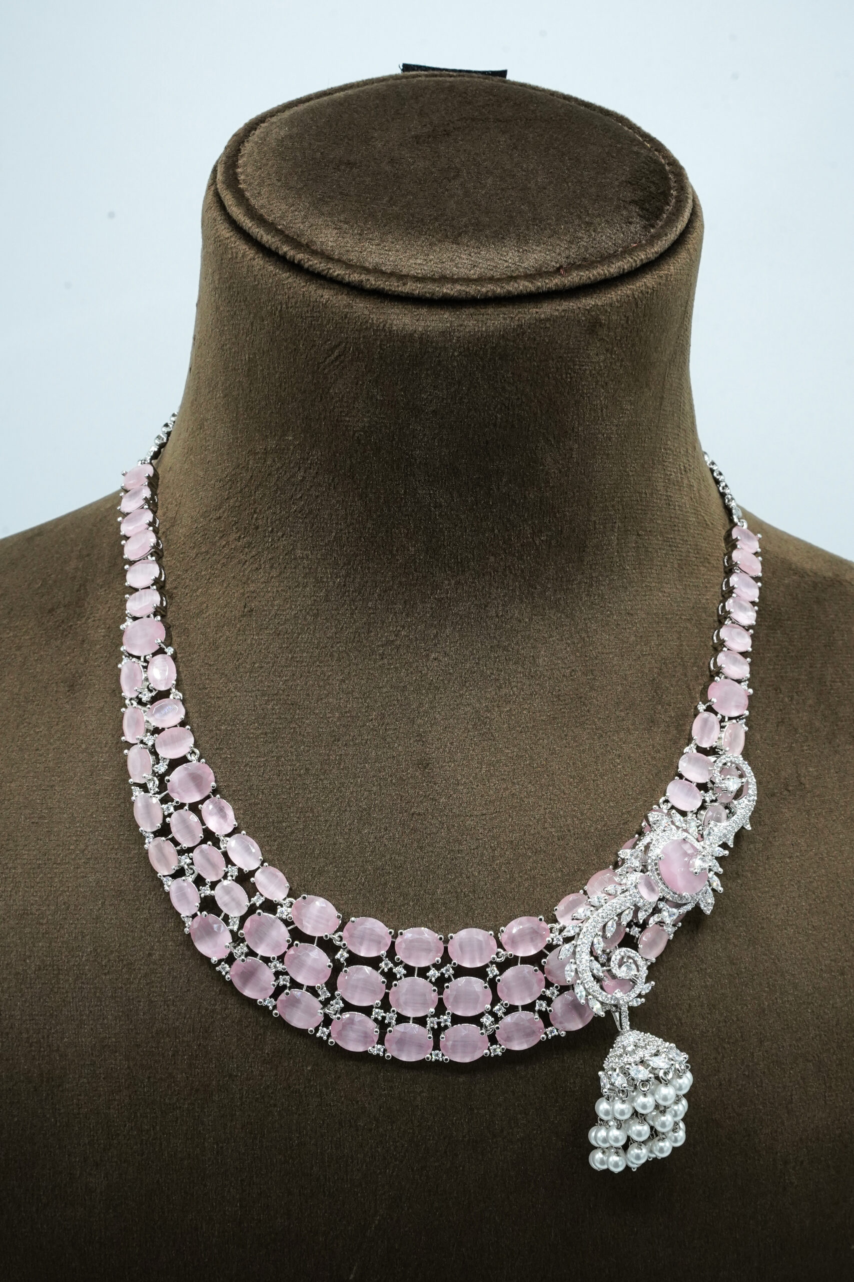 The necklace showcases three rows of smooth, translucent pink stones that sit perfectly on the neckline. The design is elevated by an exquisite side motif of silver-toned filigree and sparkling zircons, leading down to a luxurious cluster of white pearls.
