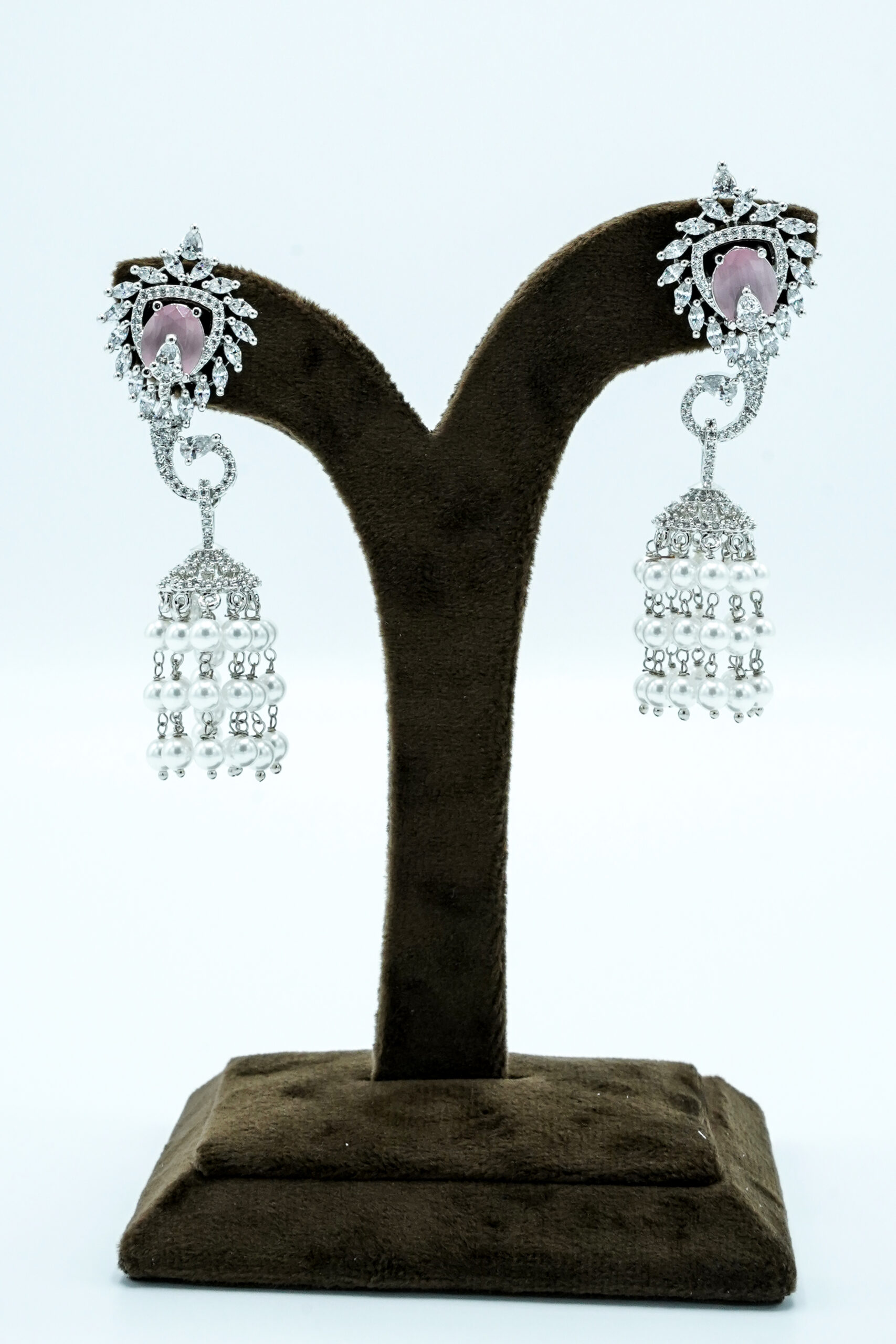 Ethereal Rose Pink Layered Necklace Set – Silver-Plated with Zirconia Accents and Pearl Jhumkas