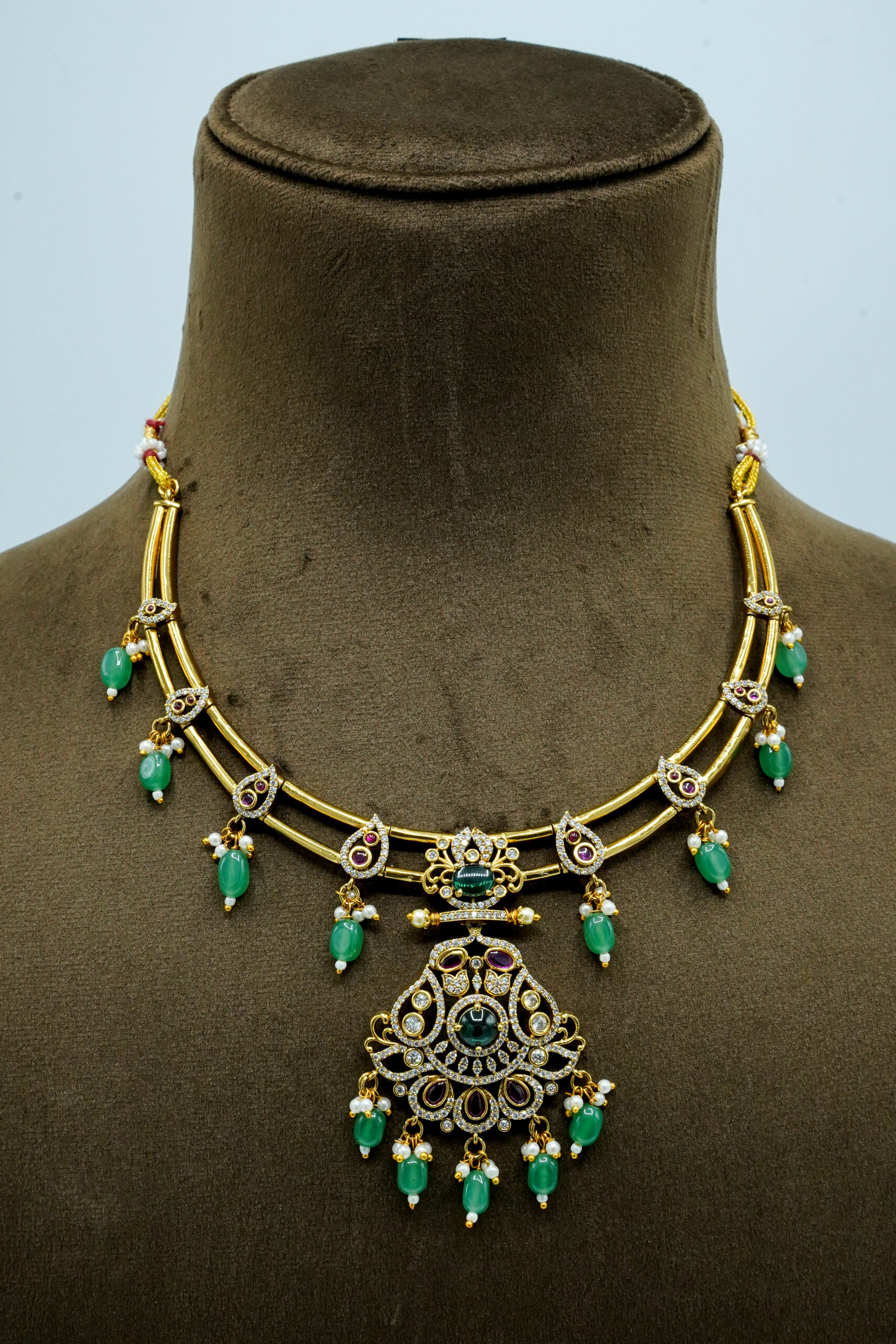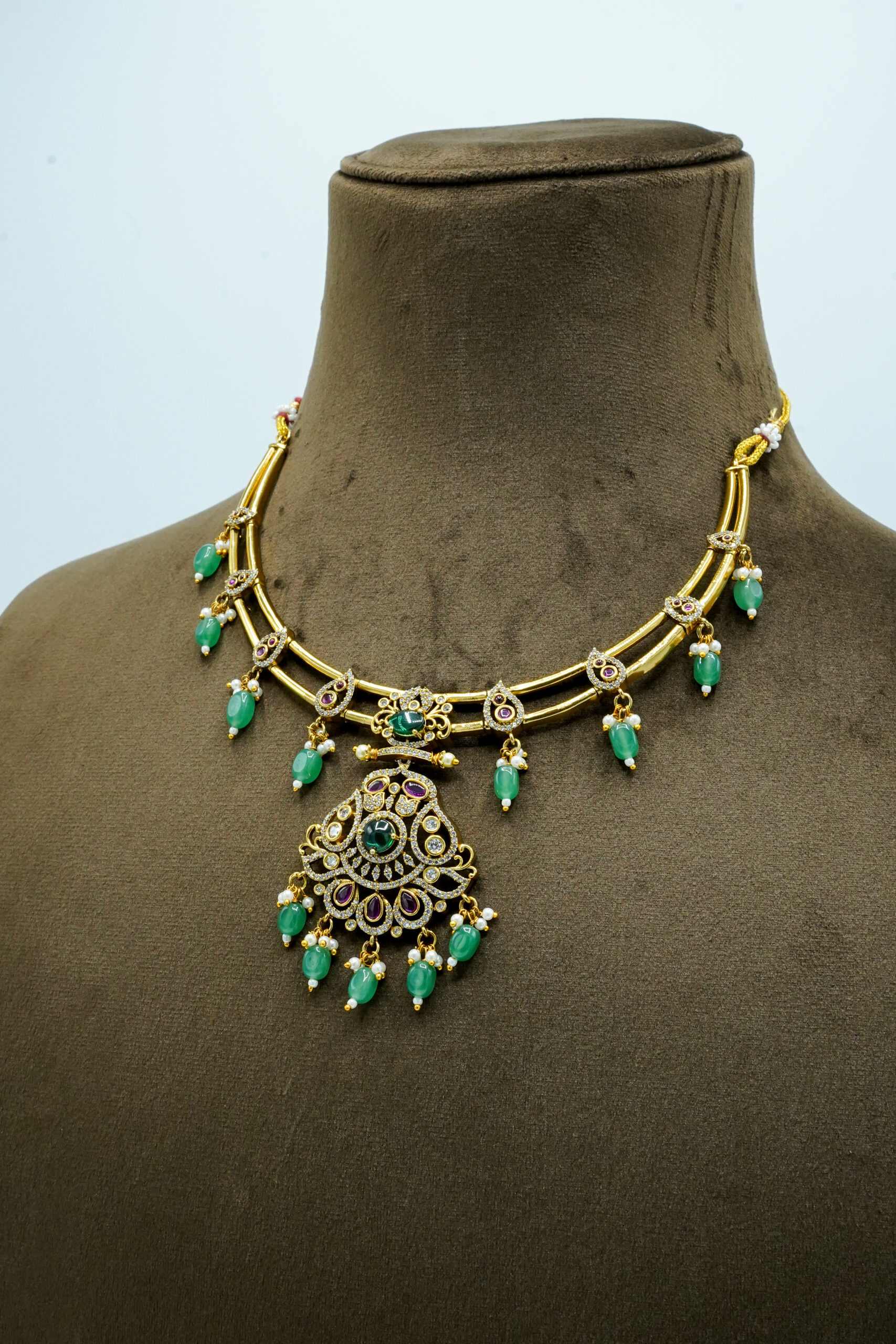 Heritage Gold-Tone Tube Necklace & Jhumka Set | Elegant Emerald Green Bead Fashion Jewellery (72C)