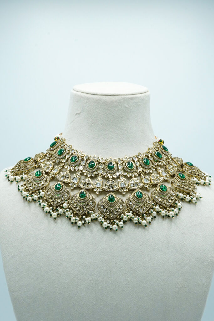 The centerpiece of the collection is the oversized medallion pendant, which showcases a floral-etched green cabochon surrounded by a halo of shimmering crystalline stones. Accompanied by matching statement earrings, this set serves as the perfect focal point for bridal wear, luxury festive attire, or formal heritage-themed events.