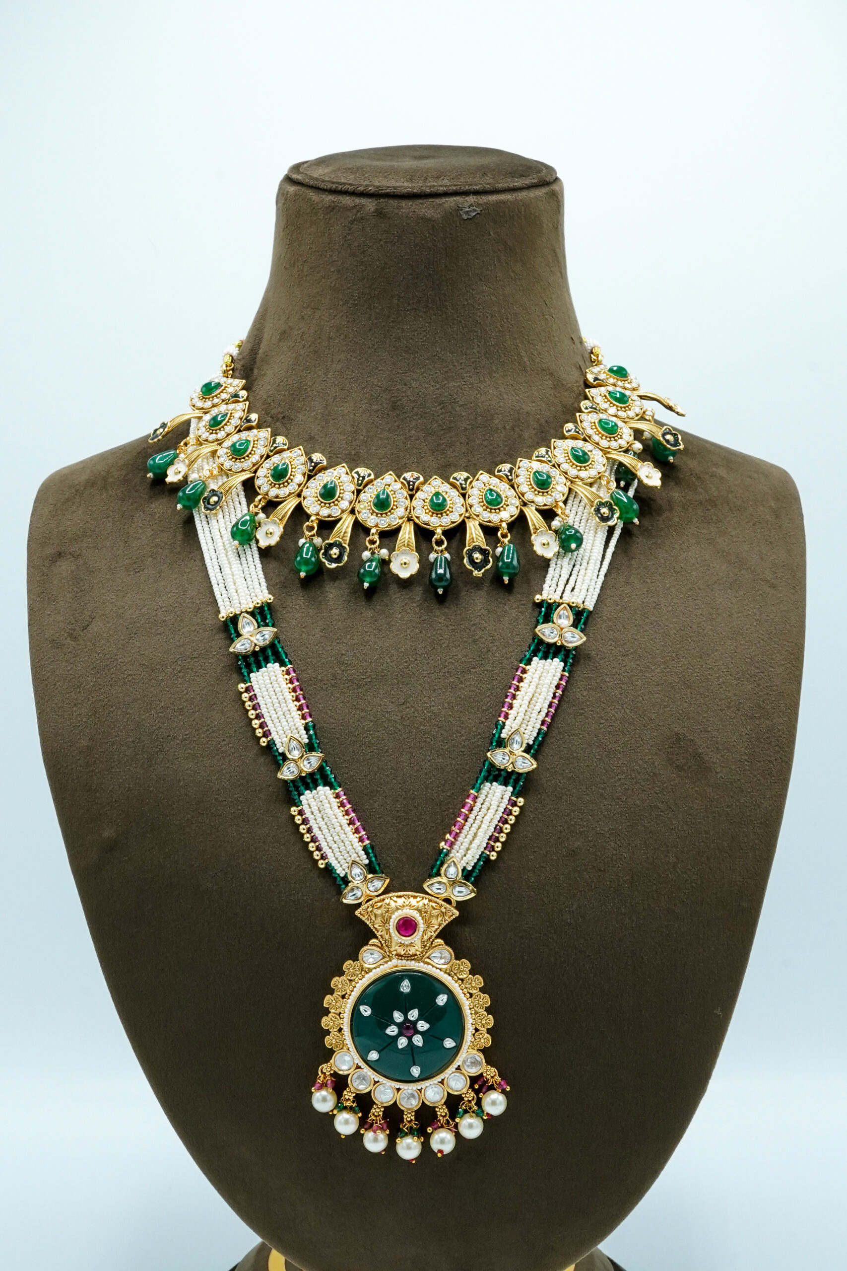 A masterfully crafted fashion jewelry set featuring a dual-layered silhouette. This set combines a structured choker with a sweeping multi-strand pearl necklace, accented by vibrant emerald-green stones and floral-etched pendants. Designed for high-impact elegance at weddings and formal gala events.