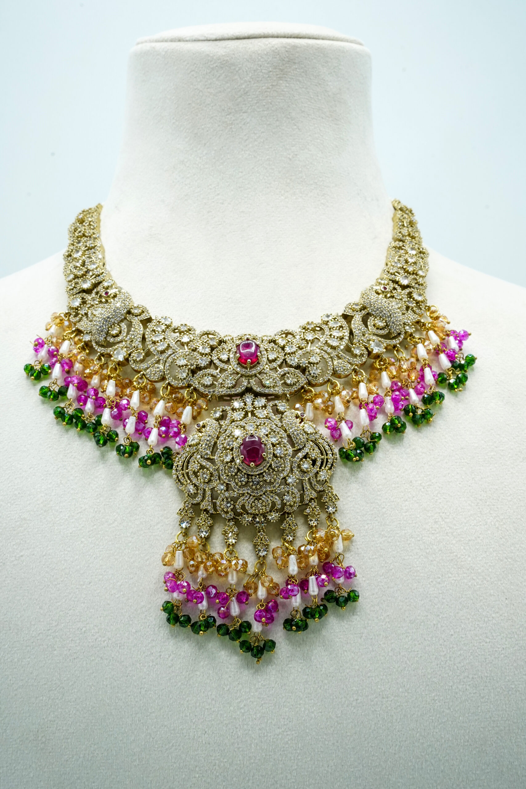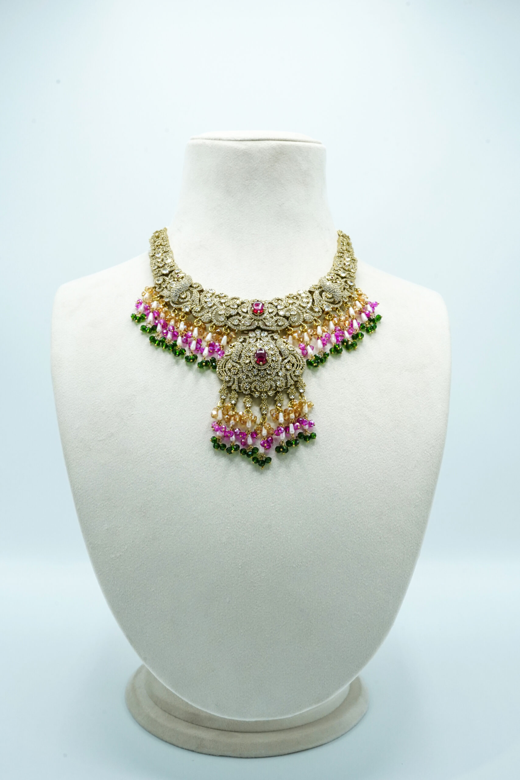 Paired with dramatic, oversized earrings that capture the same multi-layered beadwork, this set is designed to make you feel like royalty. Whether you are pairing it with a simple silk saree or a heavily embroidered lehenga, this fashion jewellery set is the ultimate statement of ethnic glamour.