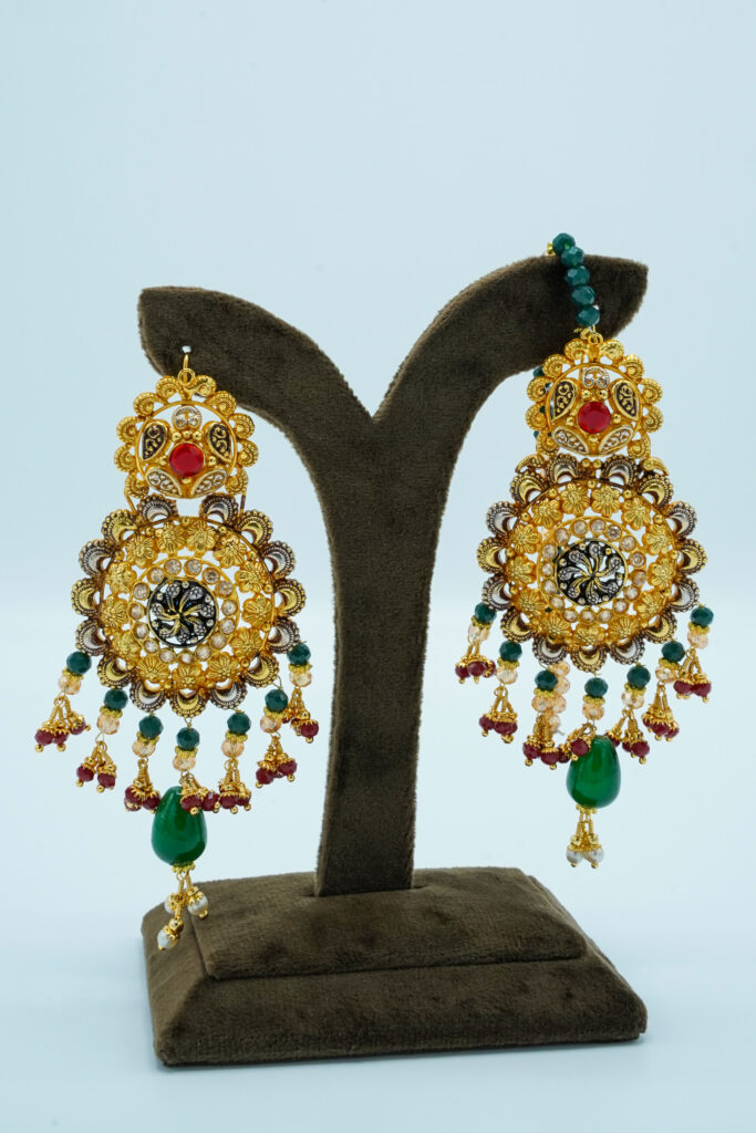 • Statement Chandelier Earrings: Matching long-drop earrings with emerald centers and floral-inspired stud tops.