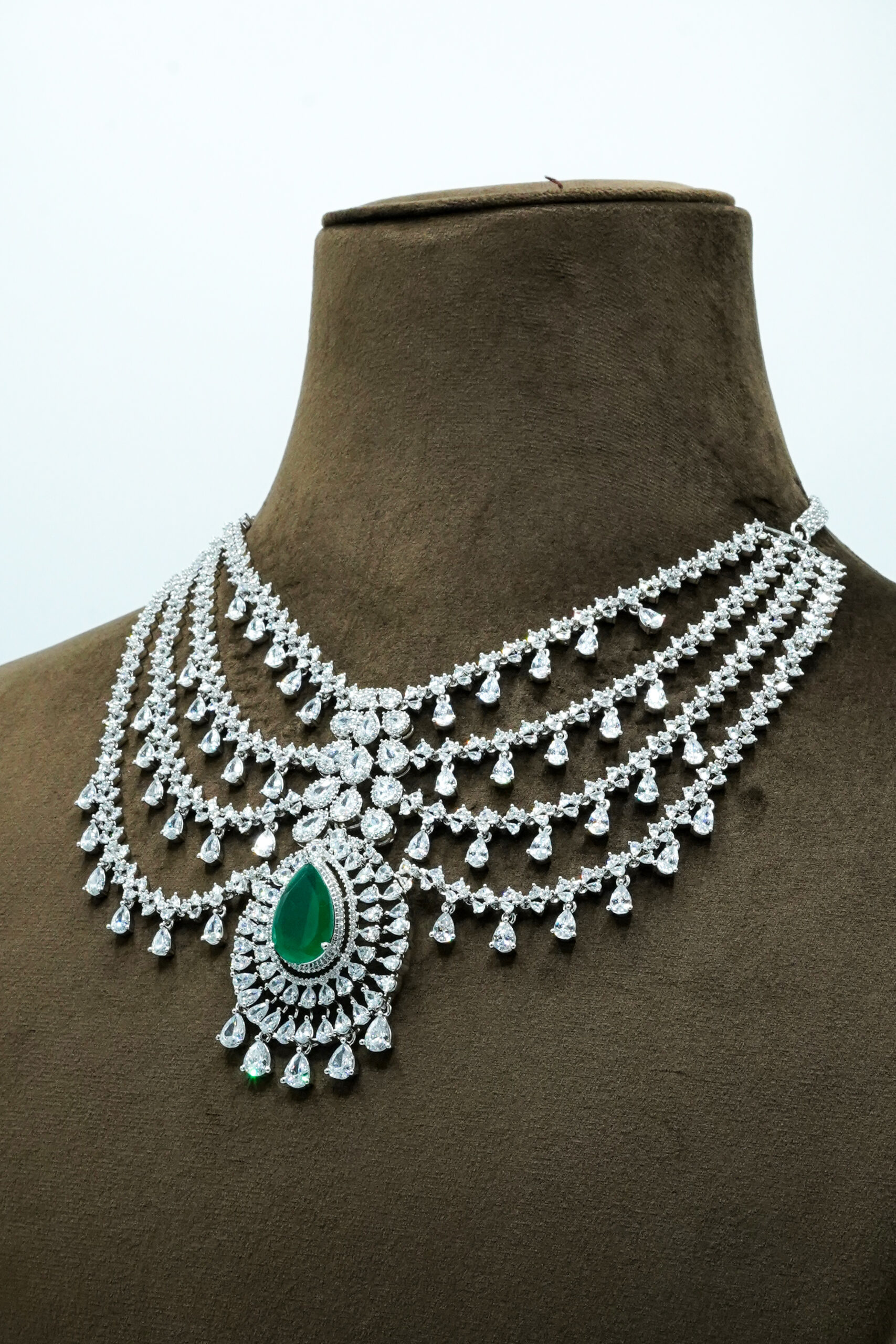 Majestic Emerald Teardrop & Zirconia Multi-Tier Garland Necklace Set – Rhodium Plated Luxury Fashion Jewellery