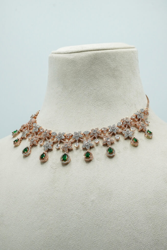The necklace is engineered with multiple tiers of shimmering white stones that drape beautifully across the collarbone, leading the eye to the vivid green teardrop pendant. The movement of the dangling “droplet” stones adds a dynamic sparkle with every turn of the head.