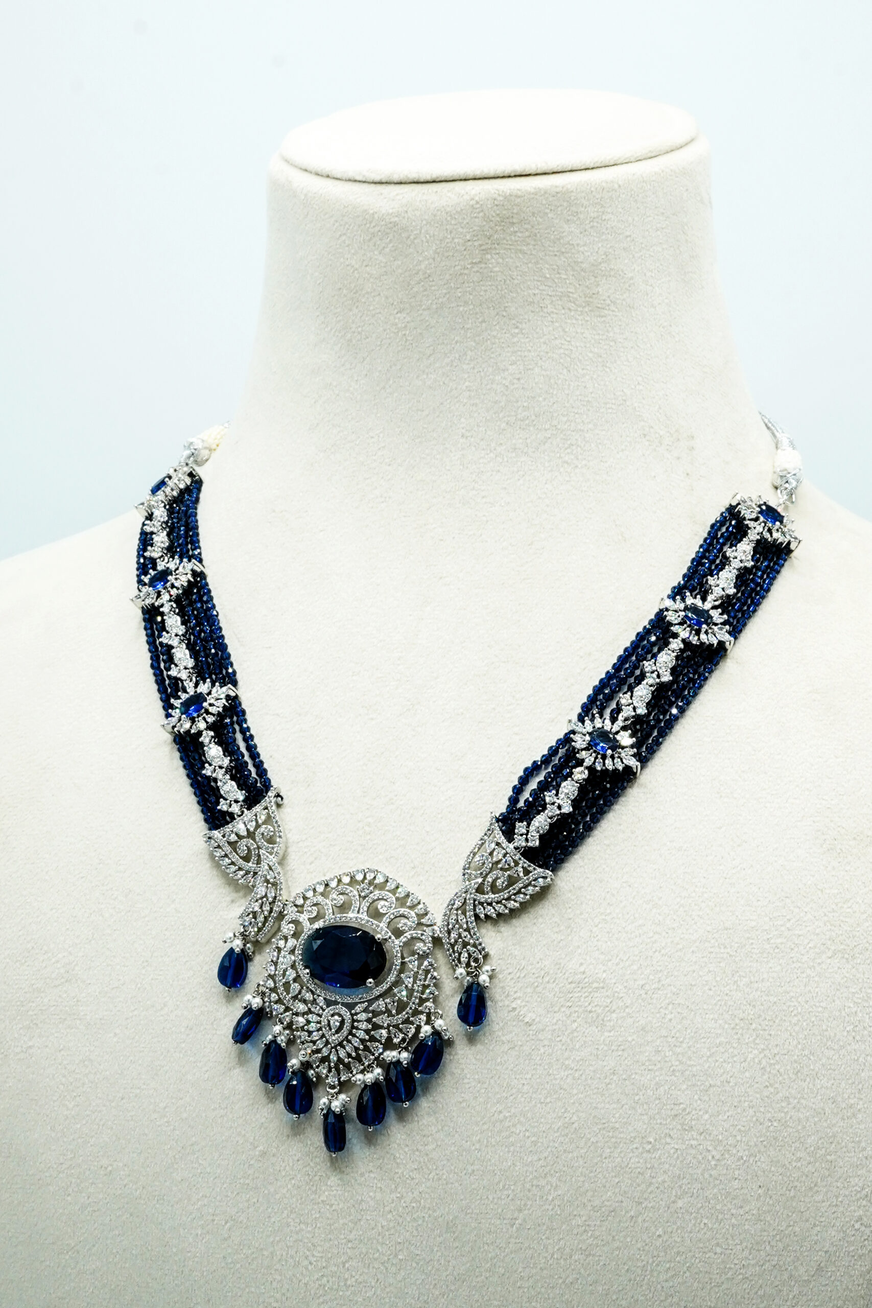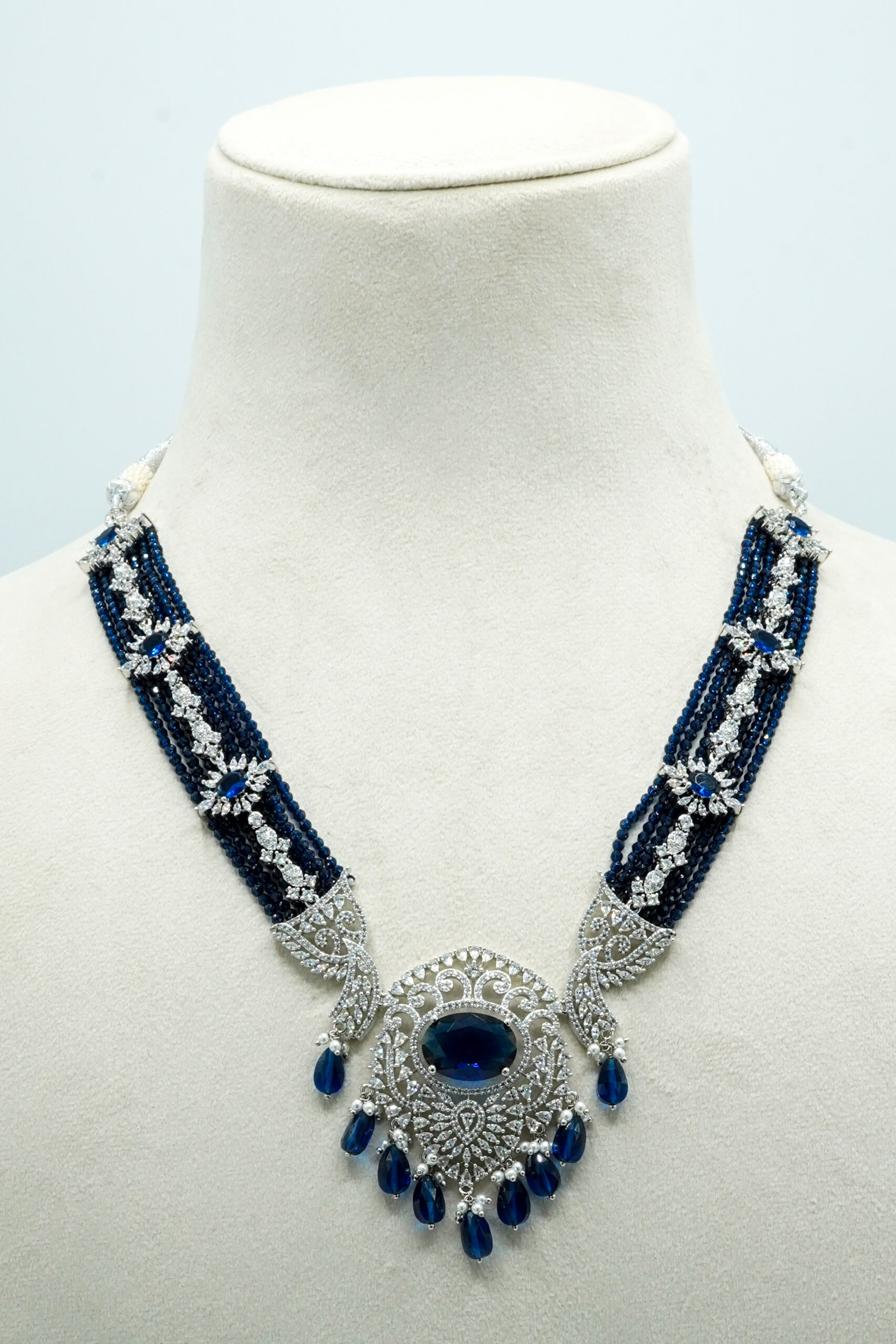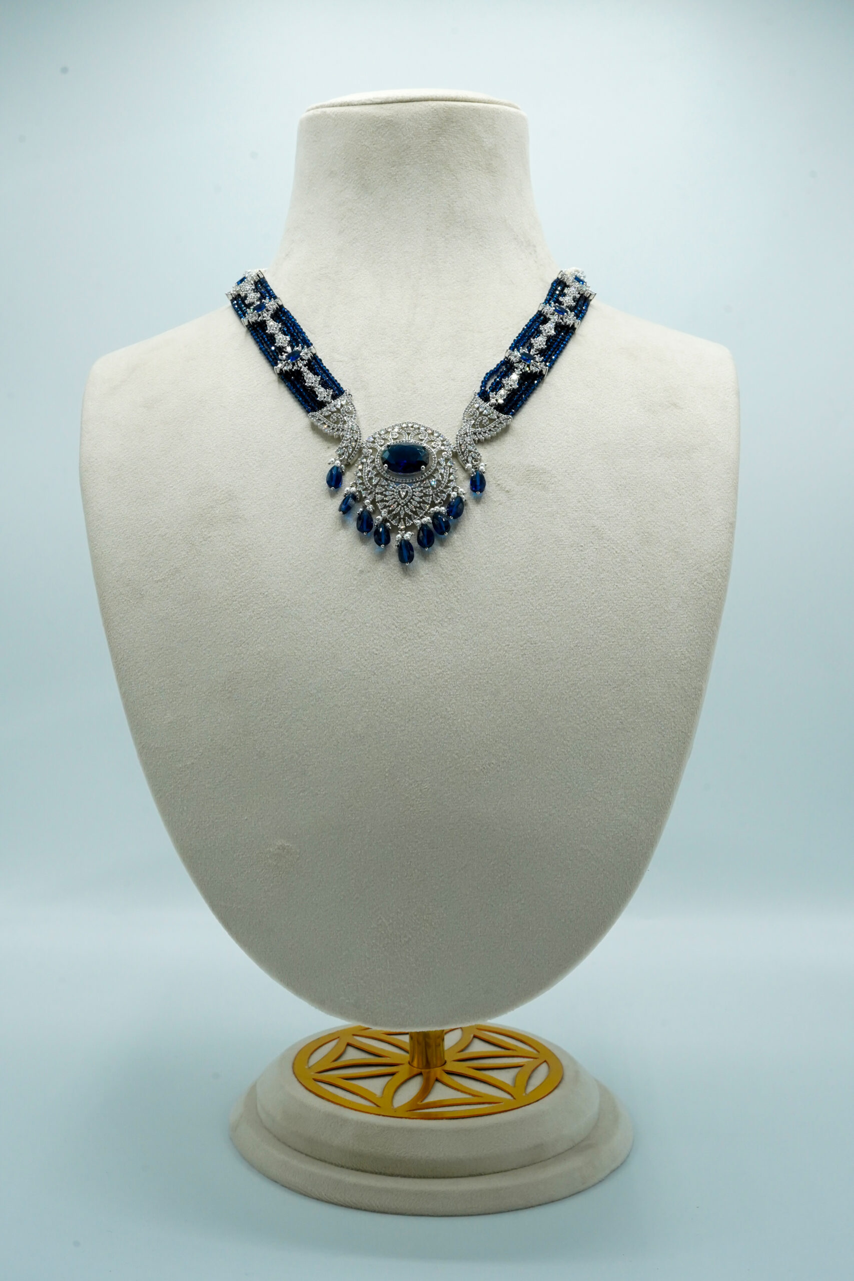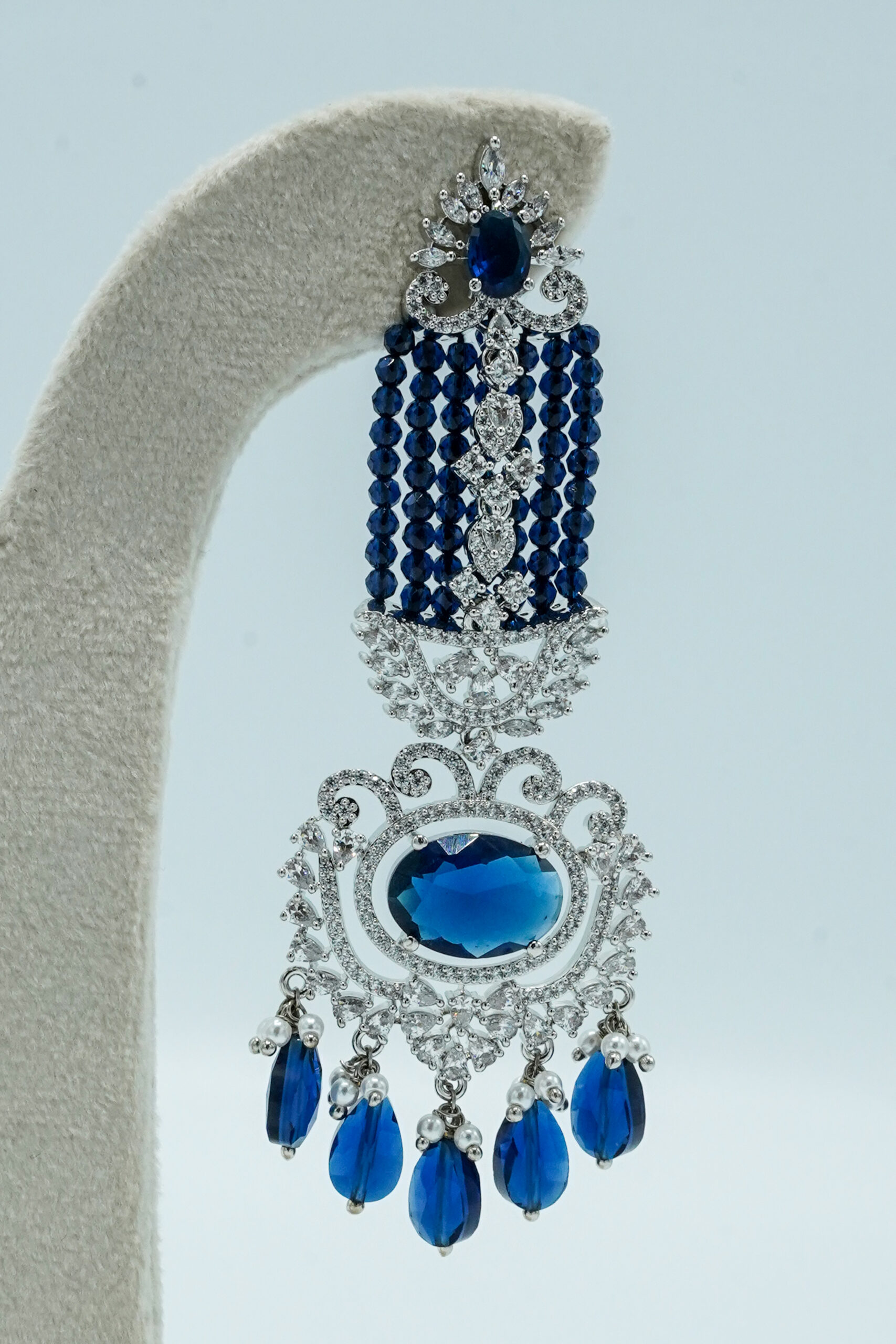 The standout feature is the sequence of deep sapphire-blue stones that run through the center and culminate in a majestic teardrop fringe. This Zewar is an exceptional choice for Valimas, evening receptions, or high-profile parties where you want a “Diamond and Sapphire” look without the staggering price tag. It combines a heavy, luxurious appearance with a lightweight feel for all-night comfort.