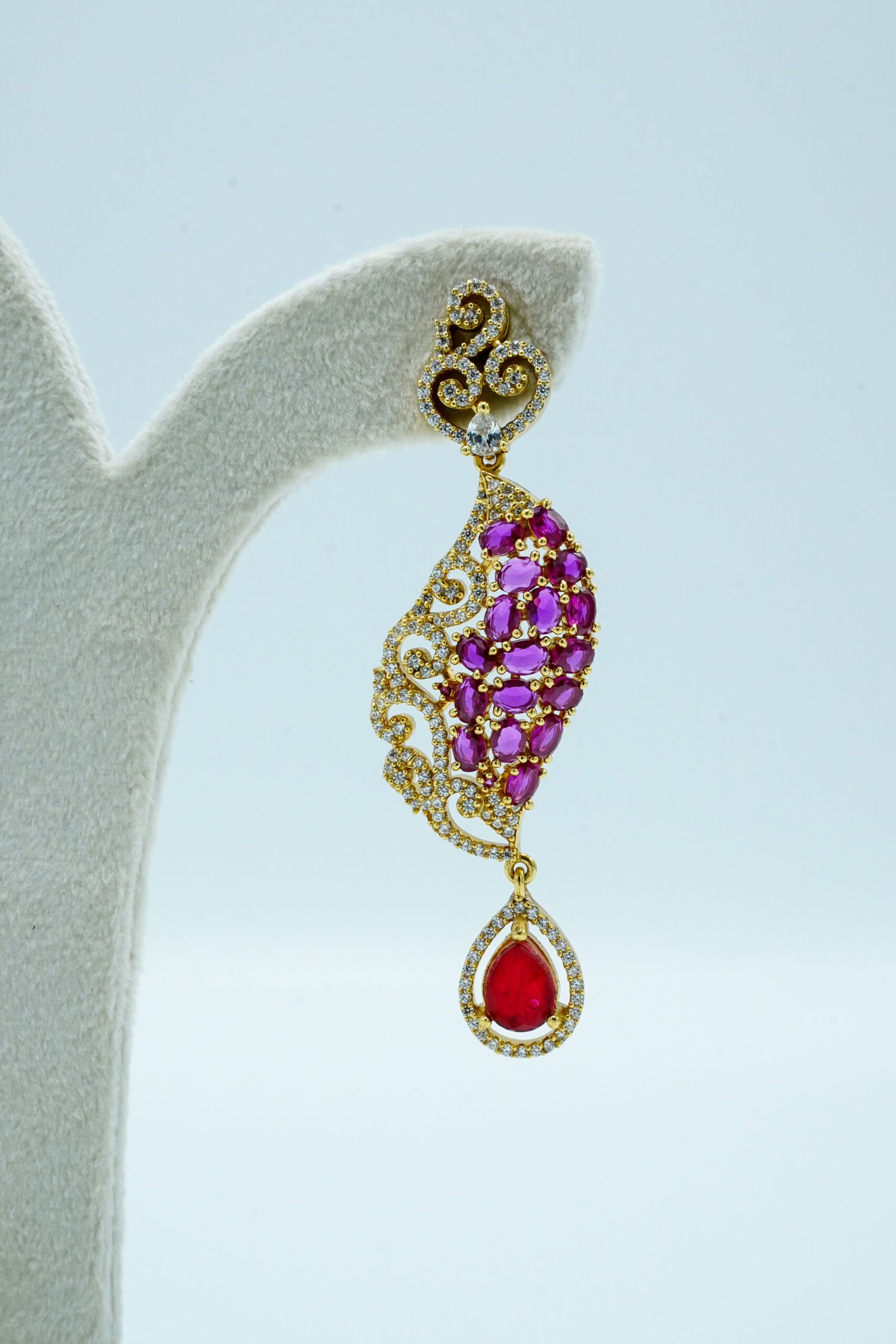 Statement Earrings: Includes matching designer drops that mirror the intricate filigree and ruby-pavé aesthetic.