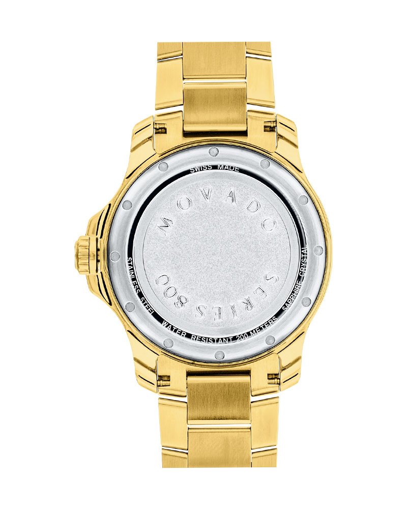 Yellow gold ion-plated stainless steel case and bracelet. Fixed yellow gold ion-plated bezel. Champagne dial with yellow gold-tone hands. No markers. The Movado dot appears at the 12 o’clock position. Dial Type: Analog. Quartz movement. Scratch resistant mineral crystal. Pull / push crown. Solid case back. Case size: 36 mm. Case thickness: 10 mm. Round case shape. Band width: 18 mm.Band length: 8 inches. Deployment clasp with a push button release. Water resistant at 30 meters / 100 feet. Functions: hours, minutes. Dress watch style. Watch label: Swiss Made. Movado Bold Champagne Dial Yellow Gold Ion-pated Ladies Watch 3600085.