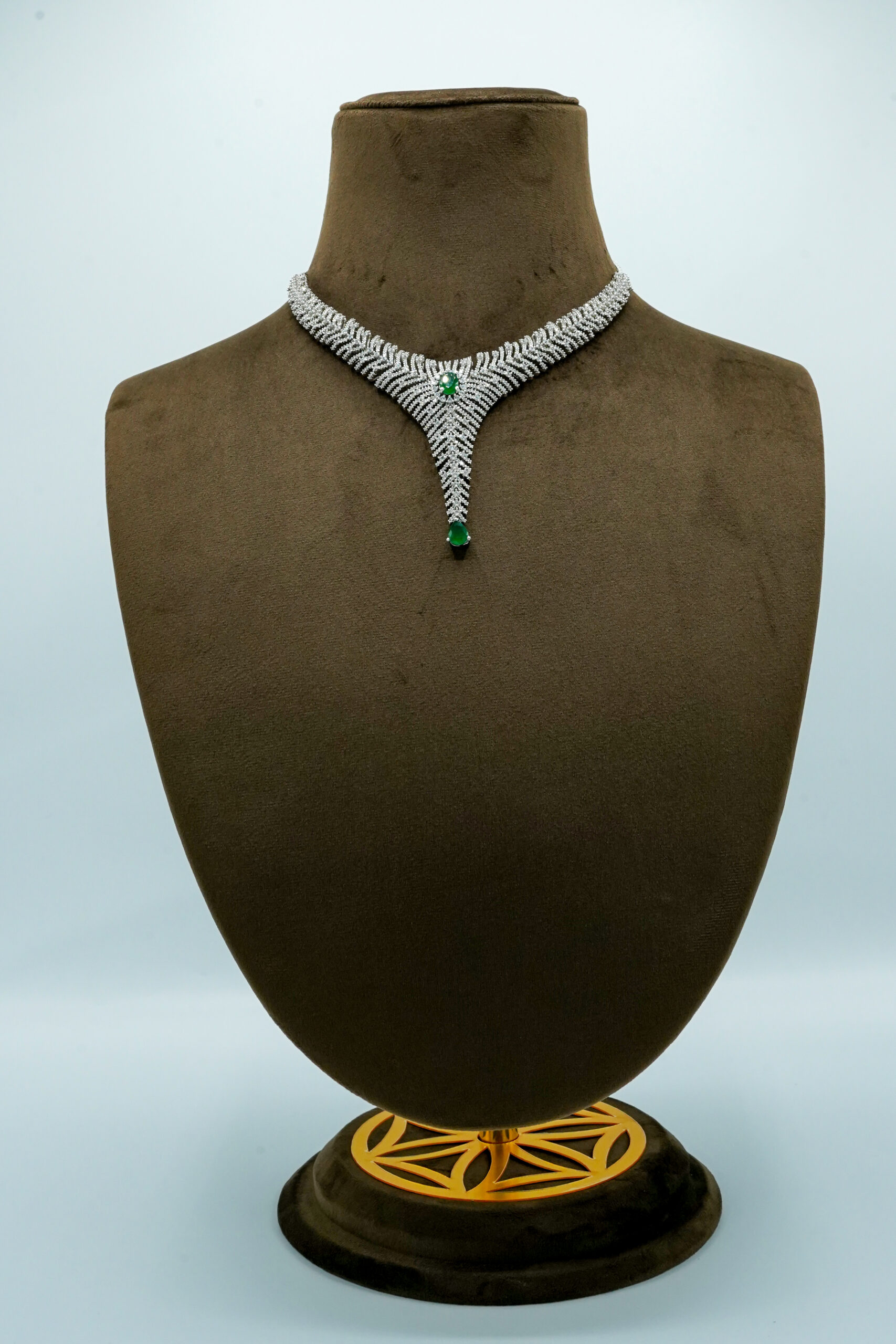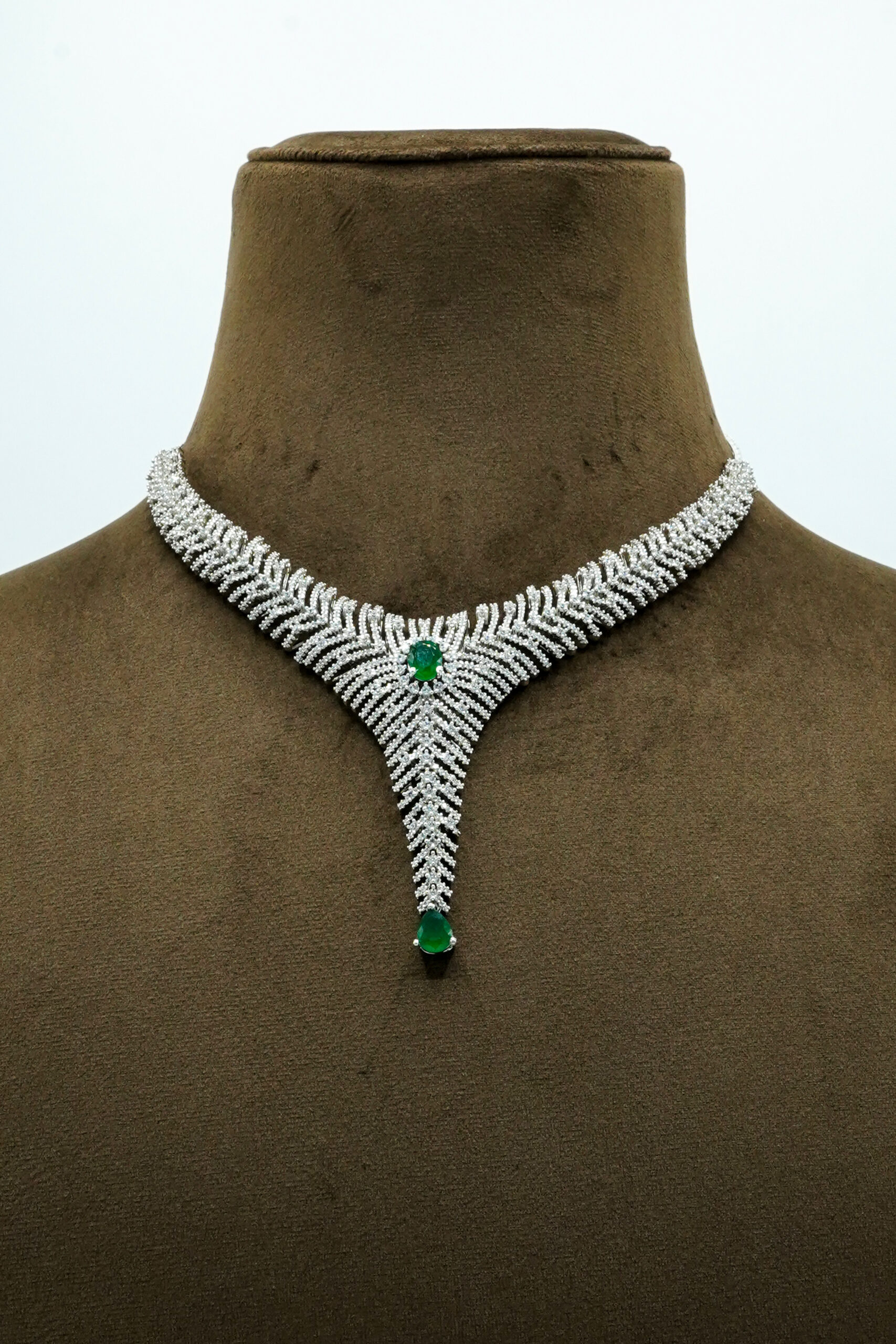 Command attention with the ‘Phoenix Wing’ Emerald & Zirconia Set. This set is a masterpiece of contemporary design, moving away from traditional floral patterns toward a more sophisticated, geometric aesthetic. The “feathered” rows of white stones create a dynamic sense of movement and brilliance.