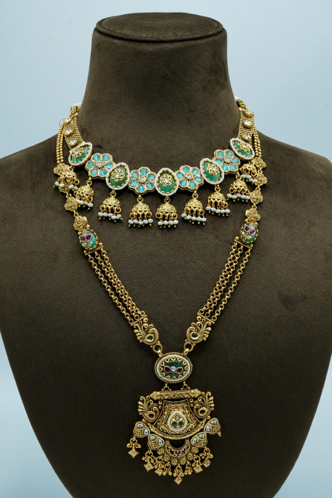 Elevate your ethnic wardrobe with our Traditional Antique Fashion Jewellery Set. Designed for the modern woman who appreciates vintage aesthetics, this set offers a regal look without the weight of real gold.