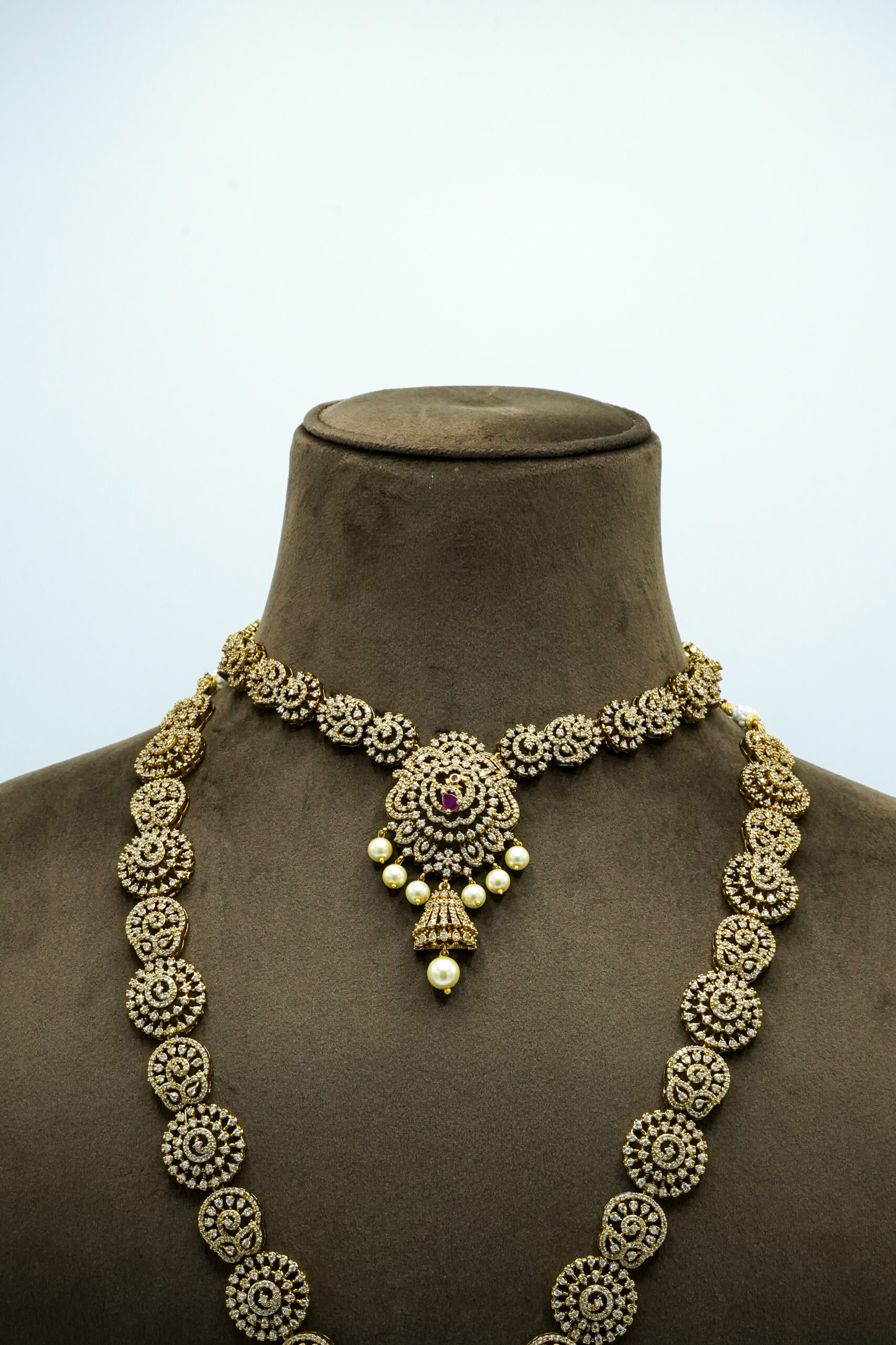 The necklace features rows of shimmering white stones that taper into a sharp V-point, leading to a magnificent emerald green teardrop drop. The intricate metalwork is inspired by fine jewellery archives, ensuring the set feels as luxurious as it looks. Paired with dramatic chandelier earrings, this set is the perfect accessory for a bride’s reception, a red-carpet gala, or an upscale formal dinner.